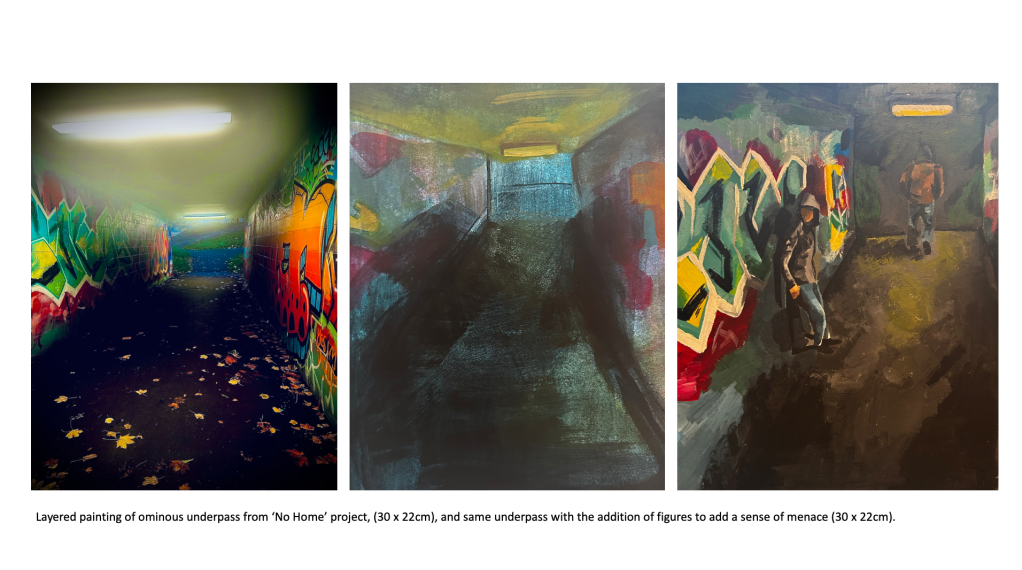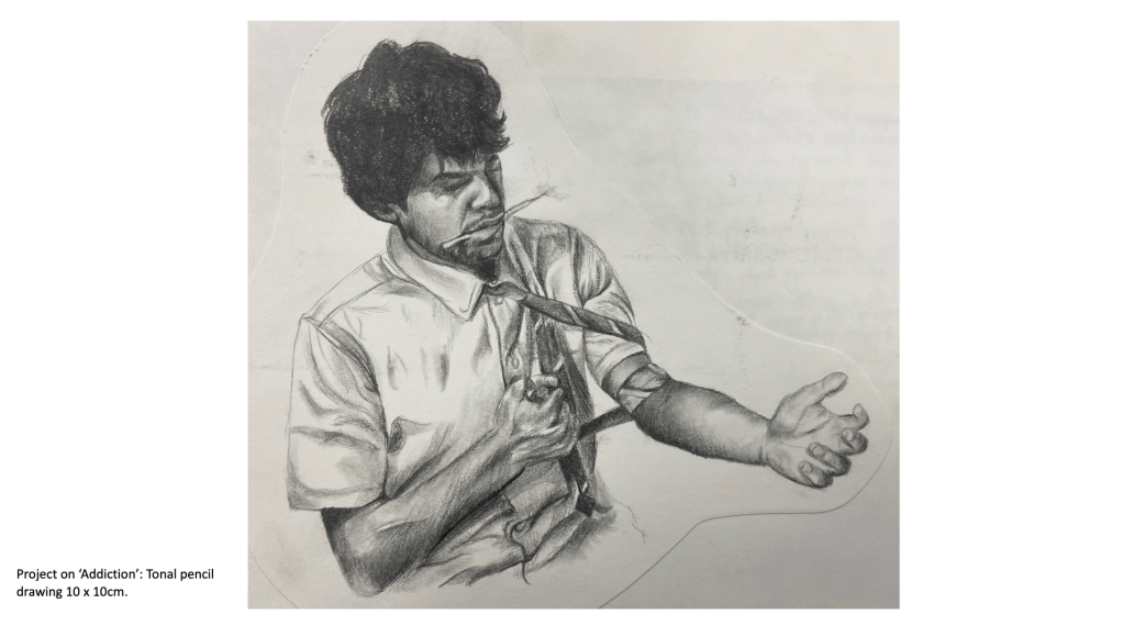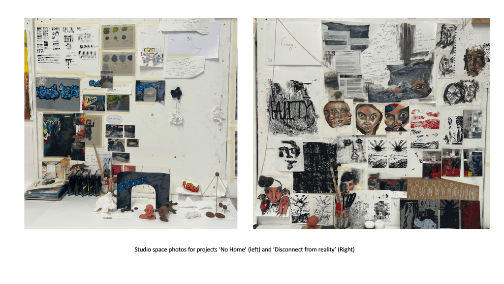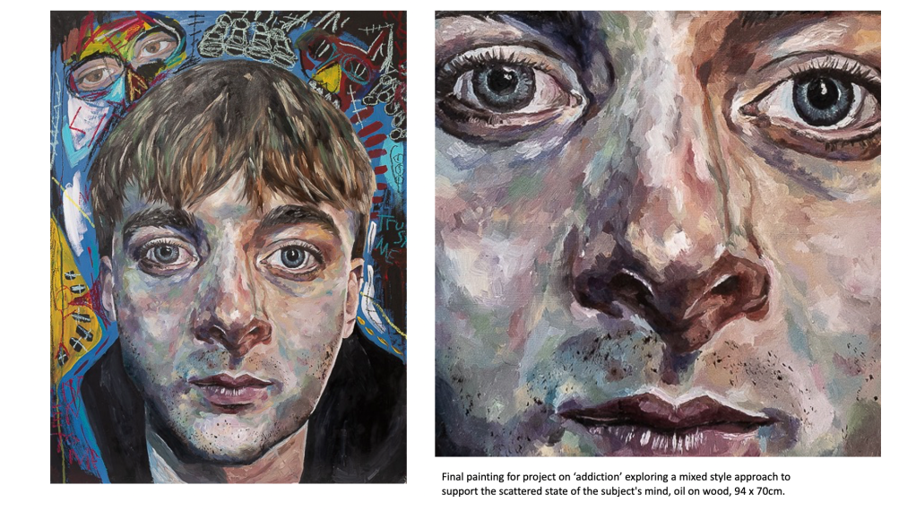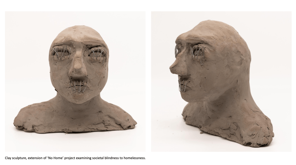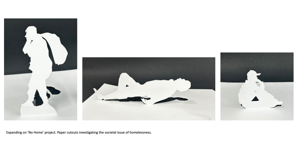 A predominant theme in my work is portraiture, as I’ve always been fascinated by the faces of those around me and how I can connect with the viewer by exposing emotions, thoughts and ideas through a subject’s face. I’ve looked at various themes and concepts throughout this body of work, but I tend to gravitate towards the figurative and psychological. From my previous projects on ‘Addiction and its Effect on the Mind’ to more current work exploring societal blindness towards the homeless population and related feelings of disconnect and disassociation from reality, my interest is in the nuance and implications of apparently simple images. My recent project created during my foundation course here at Manchester Metropolitan University took a critical stance and lead me to consider the issues surrounding homelessness, or more specifically the tendencies people have to ignore the issue entirely, stripping the individuals affected by homelessness of their dignity and humanity. The project encouraged me to use new methods and mediums such as ‘mod roc’ models and paper to create a series of silhouettes depicting homeless figures as a way to bring to life my impressions of the general population’s ignorance and insensibility.